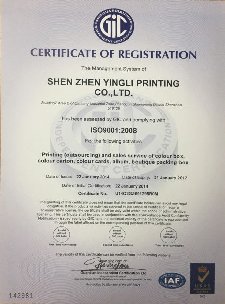 英利印刷ISO9001:2008中文版证书